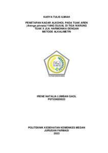 LUMBAN GAOL, IRENE NATALIA LUMBAN GAOL (2023) PENETAPAN KADAR ALKOHOL PADA TUAK AREN (Arenga pinnata) YANG DIJUAL DI TIGA WARUNG TUAK X JLN. HARMONIKA DENGAN METODE ALKALIMETRI. Diploma thesis, Poltekkes Kemenkes Medan.