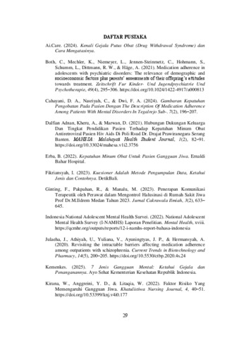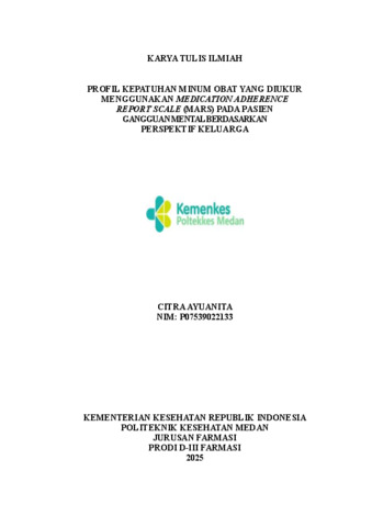 CITRA AYUANITA, CITRA AYUANITA (2025) PROFIL KEPATUHAN MINUM OBAT YANG DIUKUR MENGGUNAKAN MEDICATION ADHERENCE REPORT SCALE (MARS) PADA PASIEN GANGGUAN MENTAL BERDASARKAN PERSPEKTIF KELUARGA. Diploma thesis, Poltekkes Kemenkes Medan.