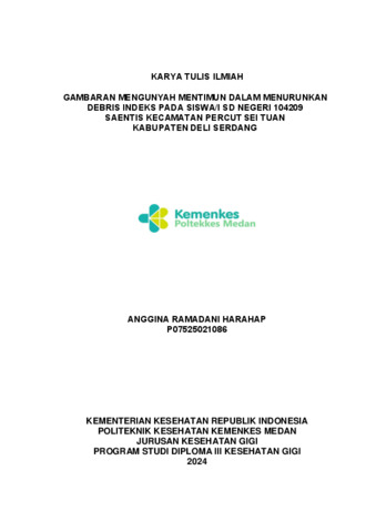 Harahap, Anggina Ramadani (2024) Gambaran Mengunyah Mentimun Dalam Menurunkan Debris Indeks pada Siswa/I SD Negeri 104209 Saentis Kecamatan Percut Sei Tuan Kabupaten Deli Serdang. Diploma thesis, Poltekkes Kemenkes Medan.