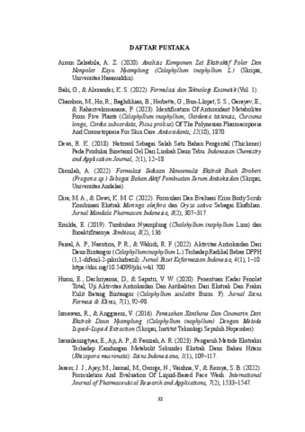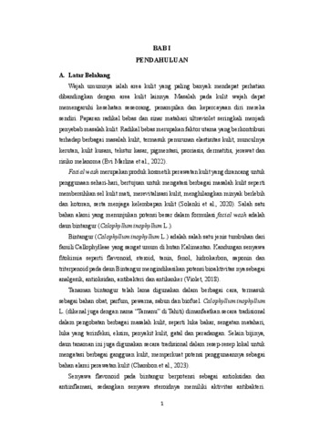 Kulit wajah merupakan bagian tubuh yang paling sering diperhatikan karena berpengaruh terhadap penampilan dan kepercayaan diri. Radikal bebas dan paparan sinar UV dapat menimbulkan berbagai masalah kulit, sehingga penggunaan produk perawatan kulit dengan kandungan antioksidan alami menjadi pilihan yang tepat. Daun bintangur (Calophyllum inophyllum L.) diketahui mengandung senyawa flavonoid, steroid dan tanin yang berpotensi sebagai antioksidan. Tujuan dari penelitian ini bertujuan adalah untuk mengetahui formula terbaik dan kestabilan sediaan facial wash dari ekstrak etanol daun bintangur.