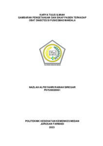 SIREGAR, NAZLAH ALFISYAHRI RABIAH SIREGAR (2024) GAMBARAN PENGETAHUAN DAN SIKAP PASIEN TERHADAP OBATDIABETES DI PUSKESMAS MANDALA. Diploma thesis, Poltekkes Kemenkes Medan.