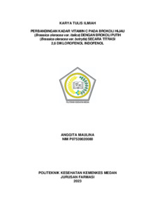 ANGGITA MAULINA, ANGGITA MAULINA (2023) PERBANDINGAN KADAR VITAMIN C PADA BROKOLI HIJAU (Brassica oleracea var. italica) DENGAN BROKOLI PUTIH (Brassica oleracea var. botrytis) SECARA TITRASI 2,6 DIKLOROFENOL INDOFENOL. Diploma thesis, Poltekkes Kemenkes Medan.