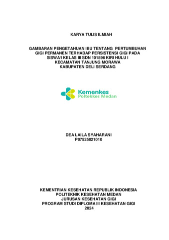 Syaharani, Dea Laila (2024) Gambaran Pengetahuan Ibu Tentang Pertumbuhan Gigi Permanen Terhadap Persistensi Gigi Pada Siswa/I Kelas Iii Sdn 101896 Kiri Hulu I Kecamatan Tanjung Morawa Kabupaten Deli Serdang. Diploma thesis, Poltekkes Kemenkes Medan.