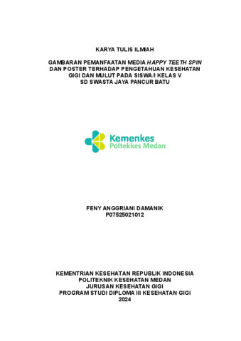 Damanik, Feny Anggriani (2024) Gambaran Pemanfaatan Media Happy Teeth Spin dan Poster terhadap Pengetahuan Kesehatan Gigi dan Mulut pada Siswa/I Kelas V SD Swasta Jaya Pancur Batu. Diploma thesis, Poltekkes Kemenkes Medan.