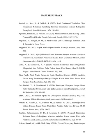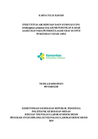 Triska, Rahmawati (2025) EFEKTIVITAS AIR REBUSAN DAUN KUMIS KUCING (Orthosiphon aristatus) DALAM MENURUNKAN KADAR ASAM URAT PADA PENDERITA ASAM URAT DI UPTD PUSKESMAS TANAH JAWA. Diploma thesis, Poltekkes Medan.