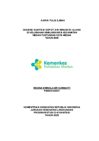 Surbakti, Regina Eminola (2025) HIGIENE SANITASI DEPOT AIR MINUM ISI ULANG DI KELURAHAN SIMALINGKAR B KECAMATAN MEDAN TUNTUNGAN KOTA MEDAN TAHUN 2025. Diploma thesis, Poltekkes Kemenkes Medan.