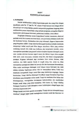 Kesimpulan dan Saran: Terapi Aktivitas Kelompok Sosialisasi efektif dalam membantu mengurangi isolasi sosial pada klien skizofrenia. Intervensi ini dapat menjadi salah satu strategi keperawatan yang penting dalam mendukung pemulihan sosial dan emosional klien dengan gangguan jiwa.
