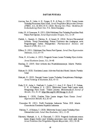 Kesimpulan Dan Saran: Senam lansia efektif dalam mengurangi nyeri pada pasien lansia dengan artritis dan dapat menjadi bagian dari intervensi keperawatan nonfarmakologis yang direkomendasikan.