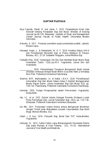 buruk. Setelah mengunyah melon, kriteria Debris Indeks baik menjadi 28 orang (71,79%), kriteria Debris Indeks sedang 11 orang (28,21%), dan tidak ada siswa/i dengan kriteria buruk. Rata-rata Debris Indeks menurun dari 1,28 sebelum menjadi 0,57 sesudah mengunyah Buah Melon, dengan penurunan sebesar 0,71. Simpulan dalam penelitian ini mengunyah Buah Melon