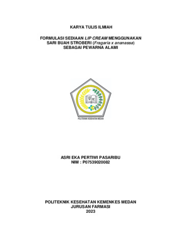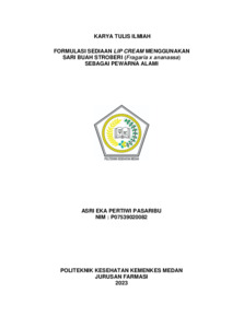 PASARIBU, ASRI EKA PERTIWI PASARIBU (2023) FORMULASI SEDIAAN LIP CREAM MENGGUNAKAN SARI BUAH STROBERI (Fragaria x ananassa) SEBAGAI PEWARNA ALAMI. Diploma thesis, Poltekkes Kemenkes Medan.