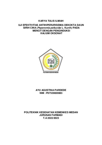 PARDEDE, AYU AGUSTINA PARDEDE (2023) UJI EFEKTIVITAS ANTIHIPERURISEMIA DEKOKTA DAUN SIRIH CINA (Peperomia pellucida L. Kunth) PADA MENCIT DENGAN PENGINDUKSI KALIUM OKSONAT. Diploma thesis, Poltekkes Kemenkes Medan.