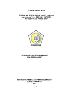 BOANGMANALU, DESY MAHOLINA BOANGMANALU (2023) FORMULASI SCRUB BUBUK KUNYIT (Curcuma domestica Val.) DENGAN VARIASI KONSENTRASI KAPUR SIRIH. Diploma thesis, Poltekkes Kemenkes Medan.
