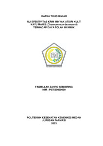 SEMBIRING, FADHILLAH ZAHRO SEMBIRING (2023) UJI EFEKTIVITAS KRIM ANTI NYAMUK DARI MINYAK ATSIRI KULIT KAYU MANIS (Cinamommum burmannii) TERHADAP DAYA TOLAK NYAMUK. Diploma thesis, Poltekkes Kemenkes Medan.