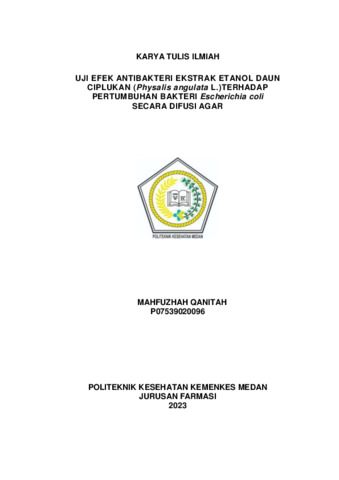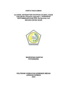 MAHFUZHAH QANITAH, MAHFUZHAH QANITAH (2023) Uji Efek Antibakteri Ekstrak Etanol Daun Ciplukan (Physalis angulata L.) Terhadap Pertumbuhan Bakteri Escherichia coli Secara Difusi Agar. Diploma thesis, Poltekkes Kemenkes Medan.