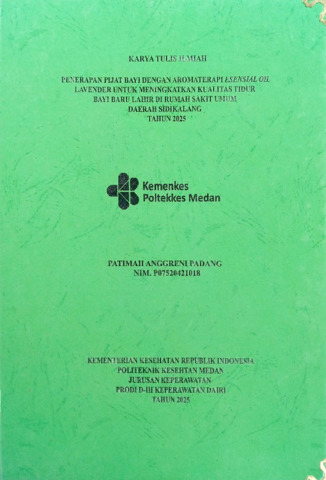 PADANG, PATIMAH (2025) ABSTRAK PENERAPAN PIJAT BAYI DENGAN AROMATERAPI ESENSIAL OIL LAVENDER UNTUK MENINGKATKAN KUALITAS TIDUR BAYI BARU LAHIR DI RUMAH SAKIT UMUM DAERAH SIDIKALANG TAHUN 2025. Diploma thesis, POLTEKKES KEMENKES MEDAN.