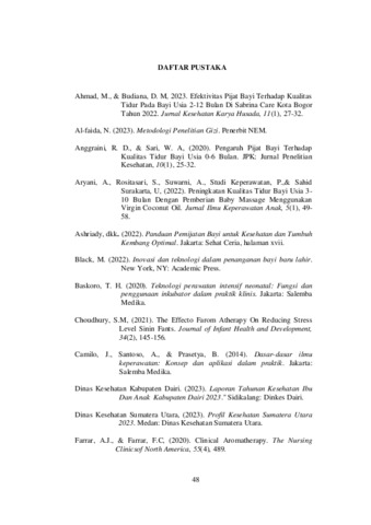 Kesimpulan Dan Saran : Penerapan pijat bayi dengan aromaterapi esensial oil lavender terbukti efektif untuk meningkatkan kualitas tidur bayi baru lahir. Terapi ini dapat dijadikan alternatif non-farmakologis yang aman dan dianjurkan bagi orang tua serta tenaga kesehatan untuk mendukung kenyamanan dan pola tidur bayi.