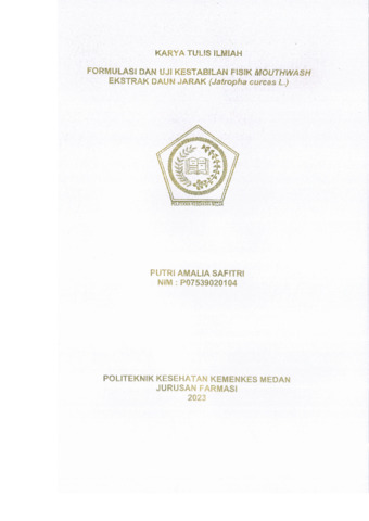 Putri Amalia Safitri, Putri Amalia Safitri (2023) FORMULASI DAN UJI KESTABILAN FISIK MOUTHWASH EKSTRAK DAUN JARAK (Jatropha curcas L.). Diploma thesis, Poltekkes Kemenkes Medan.