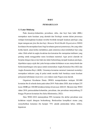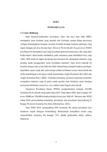 Menurut Profil Kesehatan Indonesia 2022, indikator utama dalam menilai keberhasilan program kesehatan dilihat dari Angka Kematian Ibu (AKI). Data tahun 2022 menunjukkan penurunan angka kematian ibu sebesar 3.572 kematian dibandingkan 7.389 kematian pada tahun 2021. Meskipun AKI mengalami penurunan, namun masih diperlukan upaya untuk mempercepat penurunan AKI hingga mencapai target SGDs 70 dari setiap 100.000 kelahiran hidup di tahun 2030. Faktor penyebab yang paling banyak dari kematian ibu pada tahun 2022 adalah hipertensi pada masa kehamilan (801 kasus), pendarahan (741 kasus), penyakit jantung (232 kasus), dan penyebab lainnya (1.504 kasus). (Profil Kesehatan Indonesia, 2022)