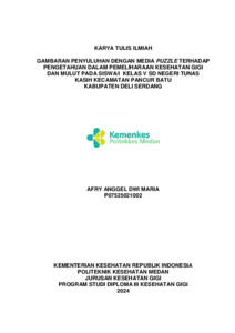 Dwi Maria, Afry Anggel (2024) Gambaran Penyuluhan dengan Media Puzzle terhadap Pengetahuan Dalam Pemeliharaan Kesehatan Gigi dan Mulut Pada Siswa/I Kelas V SD Negeri Tunas Kasih Kecamatan Pancur Batu Kabupaten Deli Serdang. Diploma thesis, Poltekkes Kemenkes Medan.