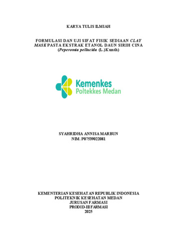 MARBUN, SYAHRIDHA ANNISA (2025) FORMULASI DAN UJI SIFAT FISIK SEDIAAN CLAY MASK PASTA EKSTRAK ETANOL DAUN SIRIH CINA (Peperomia pellucida (L.)Kunth). Diploma thesis, Poltekkes Kemenkes Medan.