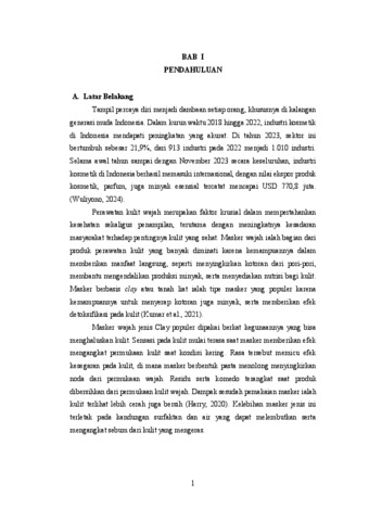 Metode Penelitian ini menggunakan desain eksperimental dengan pendekatan laboratorik. Variabel bebas adalah konsentrasi ekstrak etanol daun sirih cina (0%, 10%, 20% dan 30%), sedangkan variabel terikat meliputi sifat fisik sediaan (organoleptis, pH, homogenitas, waktu kering, stabilitas) dan tingkat kesukaan panelis (uji hedonik). Sampel yang digunakan adalah empat formula clay