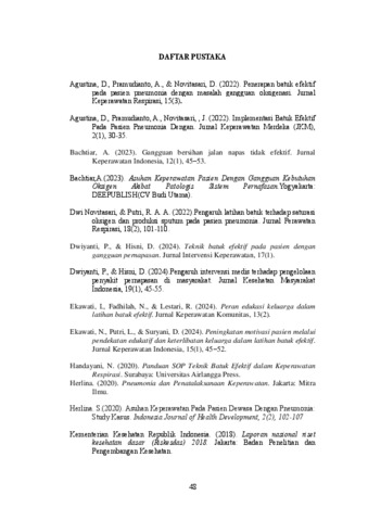 Latar Belakang: Pneumonia merupakan infeksi saluran pernapasan bahwa yang berdampak serius pada kelompok rentan. Salah satu masalah yang sering muncul adalah bersihan jalan napas tidak efektif akibat penumpukan sekret. Teknik batuk efektif menjadi salah satu intervensi non-farmakologis yang dapat membantu mengeluarkan sekret dan memperbaiki fungsi pernapasan.
