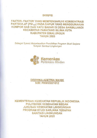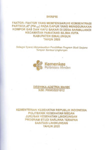 Manik, Deswika Adetria (2025) FAKTOR- FAKTOR YANG MEMPENGARUHI KONSENTRASI PARTIKULAT (PM 2,5) PADA DAPUR YANG MENGGUNAKAN KOMPOR GAS DAN KAYU BAKAR DI DESA SARIBUJANDI KECAMATAN PAMATANG SILIMA HUTA KABUPATEN SIMALUNGUN TAHUN 2025. Diploma thesis, Poltekkes Kemenkes Medan.