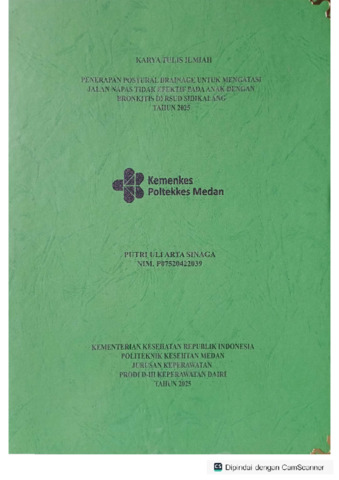 SINAGA, PUTRI ULI (2025) ANALISA PENERAPAN POSTURAL DRAINAGE UNTUK MENGATASI JALAN NAPAS TIDAK EFEKTIF PADA ANAK DENGAN BRONKHITIS DI RSUD SIDIKALANG TAHUN 2025. Diploma thesis, POLTEKKES KEMENKES MEDAN.