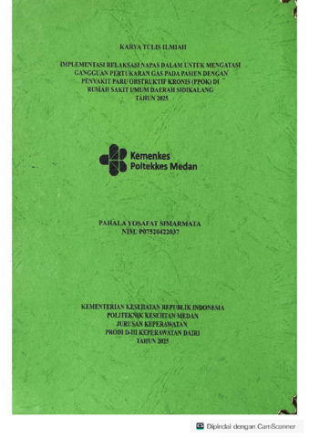 SIMARMATA, PAHALA (2025) IMPLEMENTASI RELAKSASI NAPAS DALAM UNTUK MENGATASI GANGGUAN PERTUKARAN GAS PADA PASIEN DENGAN PENYAKIT PARU OBSTRUKTIF KRONIS (PPOK) DI RUMAH SAKIT UMUM DAERAH SIDIKALANG TAHUN 2025. Diploma thesis, POLTEKKES KEMENKES MEDAN.