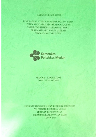 GULTOM, MANNA ULI (2025) PENERAPAN LATIHAN RANGE OF MOTION PASIF UNTUK MENGATASI MASALAH GANGGUAN MOBILITAS FISIK PADA PASIEN STROKE DI RUMAH SAKIT UMUM DAERAH SIDIKALANG TAHUN 2025. Diploma thesis, POLTEKKES KEMENKES MEDAN.