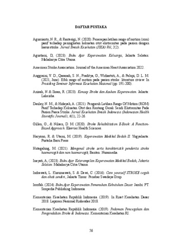 Stroke merupakan penyebab utama kecacatan yang berdampak pada gangguan mobilitas fisik akibat penurunan fungsi otot dan sendi. Salah satu intervensi efektif untuk mengatasi hal tersebut adalah latihan Range of Motion (ROM) pasif, yang bertujuan mempertahankan fleksibilitas dan meningkatkan kekuatan otot.