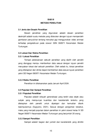 Jenis penelitian yang digunakan adalah deskriptif dengan metode survey. Penelitian ini bertujuan untuk mengetahui gambaran penyuluhan tentang menyikat gigi menggunakan video animasi terhadap pengetahuan pada siswa/i kelas IV SDN 060971 Medan Tuntungan dengan sampel keseluruhan 30 siswa/i.