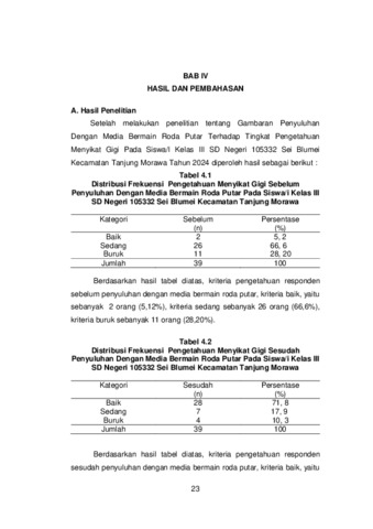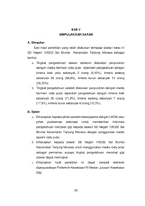 pengetahuan kriteria baik sebanyak 28 orang (71,8%), kriteria sedang sebanyak 7 orang (17,9%) dan kriteria buruk sebanyak 4 orang (10,3%). Simpulan penelitian adalah terjadinya peningkatan pengetahuan menyikat gigi siswa/i setelah dilakukan penyuluhan melalui media roda putar. Diharapkan kepada pihak sekolah bekerjasama dengan puskesmas