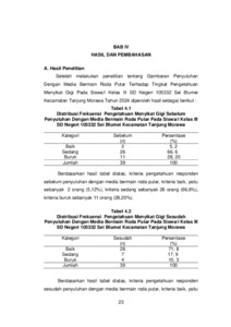 mengurangi terjadinya penyakit gigi. Kesadaran seseorang akan pentingnya kesehatan gigi dapat dilihat dari pengetahuan yang dimiliki. Untuk meningkatkan pengetahuan menyikat gigi dapat dilakukan penyuluhan dengan menggunakan media roda putar karena dapat melatih kecepatan, ketangkasan, ketepatan dalam menjawab instruksi, membangun dan memotivasi serta menimbulkan suasana yang menghibur