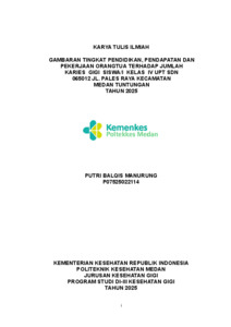 Manurung, Putri Balqis (2025) Gambaran Tingkat Pendidikan, Pendapatan dan Pekerjaan Orang Tua Terhadap Jumlah Karies Gigi Siswa/I Kelas IV UPT SDN 065012 Jl. Pales Raya Kecamatan Medan Tuntungan Tahun 2025. Diploma thesis, Poltekkes Kemenkes Medan.