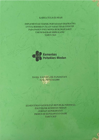 PANJAITAN, DAME (2025) IMPLEMENTASI TEKNIK PERNAFASAN DIAFRAGMA UNTUK BERSIHAN JALAN NAFAS TIDAK EFEKTIF PADA PASIEN PNEUMONIA DI RUMAH SAKIT UMUM DAERAH SIDIKALANG TAHUN 2025. Diploma thesis, POLTEKKES KEMENKES MEDAN.