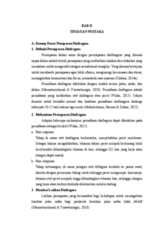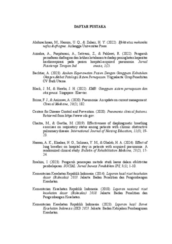 Metode Studi Kasus: Penelitian ini menggunakan desain desktiptif dengan pendekatan observasional pada dua pneumonia dengan bersihan jalan napas tidak efektif. Intervensi berupa latihan pernapasan diafragma diberikan selama 3 hari berturut-turut dengan frekuensi 2 kali sehari pagi dan sore. Data dikumpulkan melalui kuisioner klinis dan instrumen penilaian bersihan jalan napas tidak efektif.