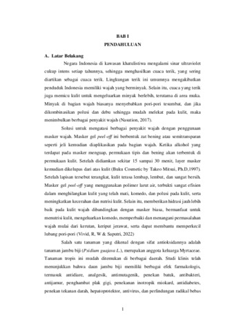 Indonesia merupakan negara beriklim tropis yang menyebabkan banyak penduduknya memiliki kulit berminyak dan rentan terhadap masalah kulit seperti jerawat dan komedo. Masker gel peel-off merupakan salah satu solusi perawatan wajah yang efektif untuk mengangkat sel kulit mati dan komedo serta memberikan kelembapan. Daun jambu biji (Psidium guajava L.) memiliki kandungan senyawa aktif seperti flavonoid dan tanin yang bersifat antibakteri dan antioksidan, yang berpotensi sebagai bahan aktif dalam sediaan kosmetik. Tujuan penelitian ini adalah