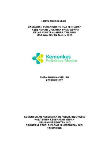 Akmaliah, Shifa Anggi (2025) Gambaran Peran Orang Tua Terhadap Kebersihan Gigi Anak Pada Siswa/I Kelas Vi Di Yp Al-Hijra Tanjung Morawa Pekan Tahun 2025. Diploma thesis, Poltekkes Kemenkes Medan.