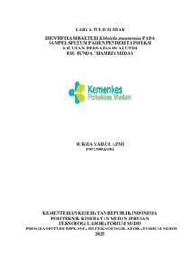 Sukma, Nailul Azmi (2025) IDENTIFIKASI BAKTERI Klebsiella pneumoniae PADA SAMPEL SPUTUM PASIEN PENDERITA INFEKSI SALURAN PERNAPASAN AKUT DI RSU BUNDA THAMRIN MEDAN. Diploma thesis, Poltekkes Medan.