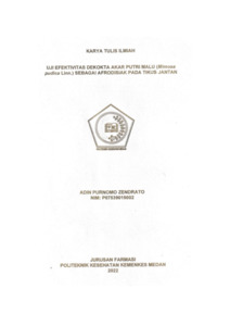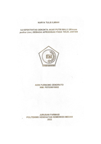 ADIN PURNOMO ZENDRATO, ADIN PURNOMO ZENDRATO (2022) UJI EFEKTIFITAS DEKOKTA AKAR PUTRI MALU (Mimosa pudica Linn.) SEBAGAI AFRODISIAK PADA TIKUS JANTAN. Diploma thesis, Poltekkes Kemenkes Medan.