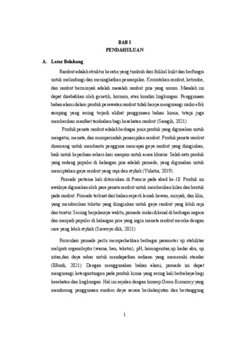 Produk penata rambut dirancang untuk membantu pengguna mencapai gaya rambut yang diinginkan, baik untuk keperluan sehari-hari maupun untuk acara khusus. Pomade merupakan suatu sediaan kosmetik rambut yang mirip dengan minyak rambut yang dibuat dengan menggunakan bahan pengkilap atau sejenis wax yang dimanfaatkan untuk menata rambut. Penelitian ini bertujuan untuk membuat formulasi pomade ekstrak daun kelor (Moringa oleifera L.) dan melakukan uji