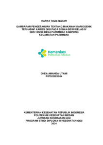 Utami, Dhea Amanda (2024) Gambaran Pengetahuan tentang Makanan Kariogenik Terhadap Karies Gigi Pada siswa/i Kelas IV SDN 105298 Desa Patumbak Kampung Kec. Patumbak. Diploma thesis, Poltekkes Kemenkes Medan.