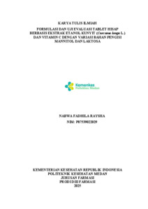NABWA FADHILA RAYSHA, NABWA FADHILA RAYSHA (2025) FORMULASI DAN UJI EVALUASI TABLET HISAP BERBASIS EKSTRAK ETANOL KUNYIT (Curcuma longa L.) DAN VITAMIN C DENGAN VARIASI BAHAN PENGISI MANNITOL DAN LAKTOSA. Diploma thesis, Poltekkes Kemenkes Medan.