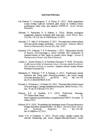 Kunyit (Curcuma longa L.) merupakan tanaman obat yang mengandung kurkumin dengan aktivitas antioksidan, antiinflamasi, antibakteri, dan imunomodulator. Namun, efektivitas terapeutiknya terbatas akibat kelarutan air yang rendah dan bioavailabilitas yang buruk karena metabolisme lintas pertama di hati. Untuk mengatasi hal ini, dikembangkan sediaan tablet hisap (troches) yang memungkinkan penyerapan langsung melalui mukosa mulut. Penelitian ini bertujuan mengembangkan dan mengevaluasi formulasi tablet hisap berbasis ekstrak etanol kunyit dan asam askorbat, dengan lima variasi rasio mannitol-laktosa sebagai bahan pengisi.