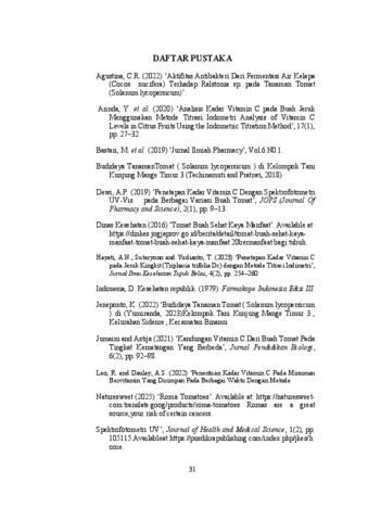 Kesimpulannya, terdapat perbedaan signifikan kadar vitamin C antar varietas tomat. Disarankan agar masyarakat memilih tomat matang sempurna, khususnya tomat merah bulat, untuk memenuhi kebutuhan vitamin C harian. Penelitian lanjutan dapat menggunakan metode lain sebagai pembanding