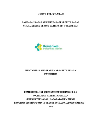 Sinaga, Shinta Bella Anggraini Margareth (2025) GAMBARAN KADAR ALBUMIN PADA PENDERITA GAGAL GINJAL KRONIK DI RSUD Dr. PIRNGADI KOTA MEDAN. Diploma thesis, Poltekkes Medan.