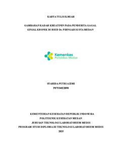 Azimi, Syahida Putri (2025) GAMBARAN KADAR KREATININ PADA PENDERITA GAGAL GINJAL KRONIK DI RSUD Dr. PIRNGADI KOTA MEDAN. Diploma thesis, Poltekkes Kemenkes Medan.