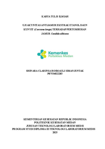 Simanjuntak, Shinara Clarinsa Rosmauli (2025) UJI AKTIVITAS ANTIJAMUR EKSTRAK ETANOL DAUN KUNYIT (Curcuma longa) TERHADAP PERTUMBUHAN JAMUR Candida albicans. Diploma thesis, Poltekkes Medan.