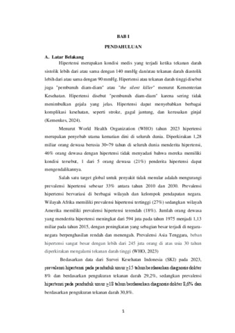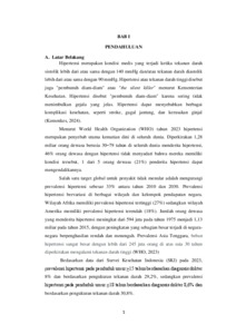 Latar belakang: Hipertensi merupakan kondisi medis yang terjadi ketika tekanan darah sistolik lebih dari atau sama dengan 140 mmHg dan/atau tekanan darah diastolik lebih dari atau sama dengan 90 mmHg. Hipertensi dapat menyebabkan